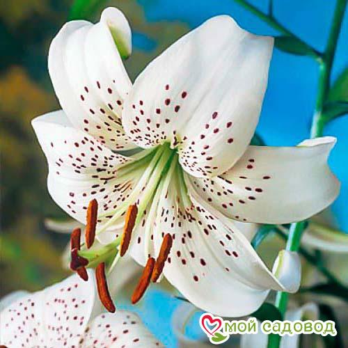 Лилия Уайт Тайгер — это эффектное многолетнее растение с крупными чалмовидными поникающими цветками. Цвет белоснежный с ярким красно-бордовым крапом. Большое количество цветков на цветоносе, их диаметр до 12 см. Максимальное развитие на 3—4 год. Высота до 120 см. Цветение июль-август.   ПОСАДКА, ОСОБЕННОСТИ УХОДА Высадка луковиц весенне-осенняя, сентябрь-ноябрь, весной — с марта по май. Требуется хорошо дренируемая почва, солнечное место. Свежие органические удобрения не используют. Глубина посадки до 20 см, под луковицу внести песок. На чернозёме подкормка не нужна, в иных случаях желательна трёхкратная минеральная подкормка: ростков; растений при бутонизации; после цветения. Морозоустойчива (до -30). На одном месте растёт до 5 лет.   ЛИЛИЯ УАЙТ ТАЙГЕР: ВОЗМОЖНОСТИ ИСПОЛЬЗОВАНИЯ ГИБРИДА Сажают: на срезку (транспортировку переносит); на выгонку; для украшения участка (хороша как доминирующий центр смешанного цветника, в букетной посадке на газоне). В нашем интернет-магазине вы сможете купить Лилии Так же возможно вас заинтересуют Лилия восточная (ориенталь) Салмон Стар и Лилия Ланкон .